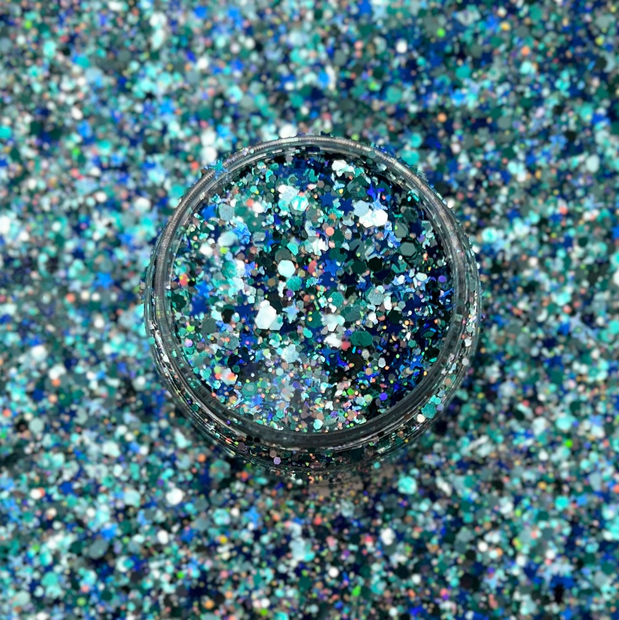 Sassy Cow Co. Chunky Mix Holographic Blues and Silver. Dark blue stars and silver 4 point stars Glitter
